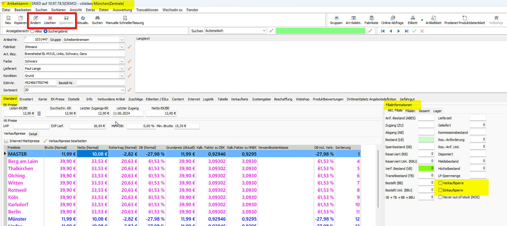 Artikelstamm / Reiter Standard - Filialinformation