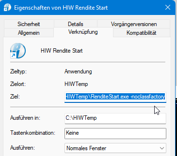 Sobald HIW komplett geschlossen ist, sollte es über die Desktop Verknüpfung (nicht aus der Taskleiste) gestartet werden; das ist immer empfehlenswert, da nur dort Startparameter hinterlegt sind, die für die richtige Ausführung benötigt werden.