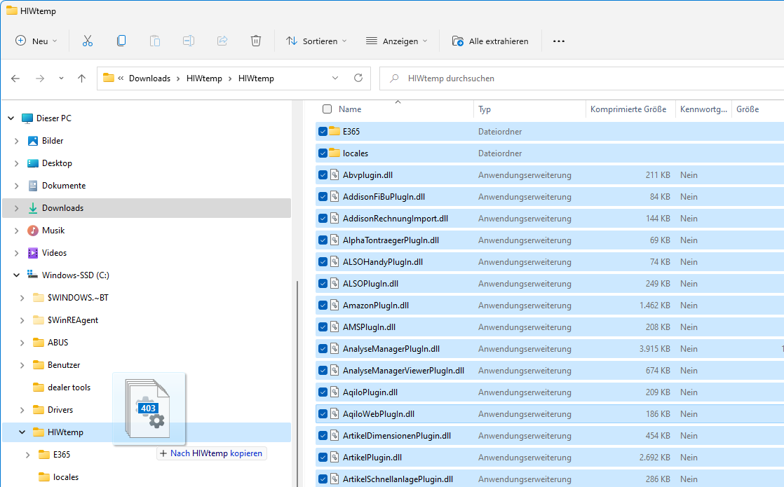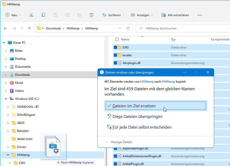 Das Update muss auf folgende Art auf dem PC bereitgestellt werden: Öffnet die heruntergeladene .zip-Datei und zieht alle darin enthaltenen Dateien in den aktuell vorhandenen "HIWtemp" Ordner auf dem jeweiligen PC (immer unter Windows-SSD (C:) von "diesem PC").