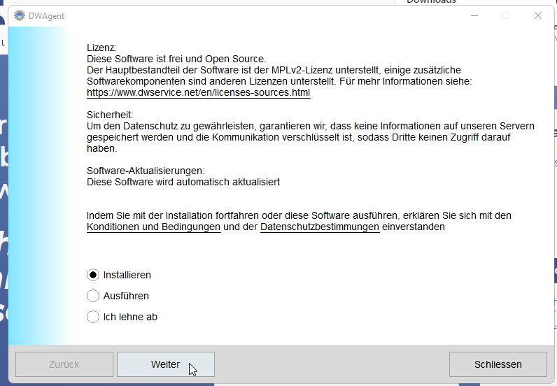 Nach dem Öffnen der Datei werden die Schritte zur Installation angezeigt. Die abgefragten Schritte können jeweils mit der Standard-Auswahl und "weiter" durchlaufen werden.