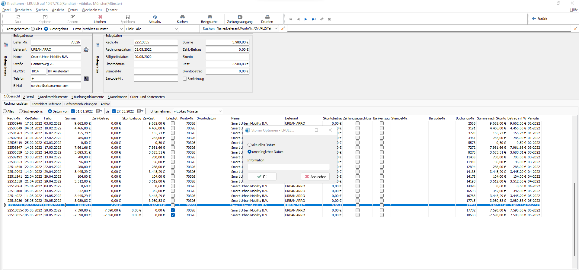 Schritt 4: im sich öffnenden Dialogfenster "ursprüngliches Datum" auswählen, Storno Grund angeben und "ok" klicken.